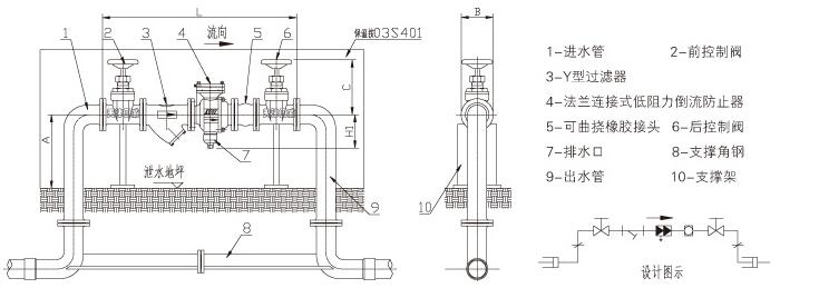 (2) 倒流防止器前后應設置控制閥門,用于關閉或開啟水流通道,以便于維修時更換倒流防止器。
